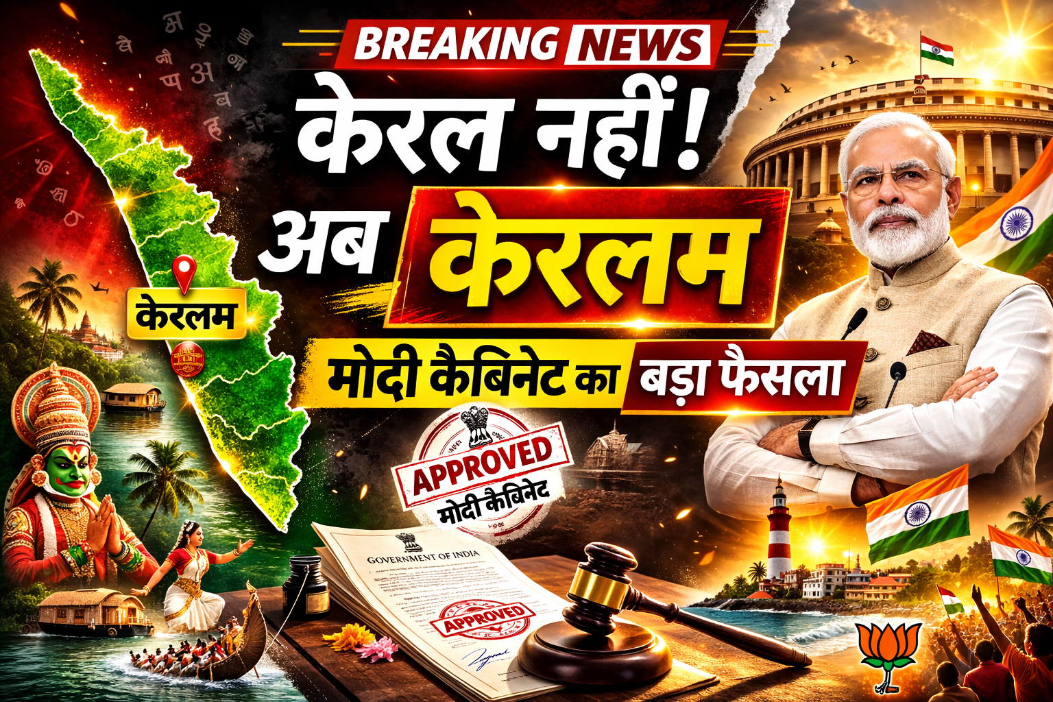 नई दिल्ली। केंद्र की मोदी सरकार ने एक ऐतिहासिक फैसला लेते हुए केरल राज्य का नाम बदलकर ‘केरलम’ करने को मंजूरी दे दी है। मंगलवार, 24 फरवरी 2026 को हुई केंद्रीय मंत्रिमंडल की बैठक में इस प्रस्ताव पर मुहर लगा दी गई। इसके बाद अब आधिकारिक तौर पर केरल को ‘केरलम’ के नाम से जाना जाएगा।